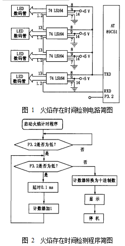 石油產品閃點溫度下的閃火火焰的存在時間是閃點檢測儀表電路設計的重要參數, 為測出火焰存在時間, 筆者利用 AT89C51 制成一臺火焰存在時間檢測裝置, 其電路簡圖如圖 1 所示, 主要流程圖如圖 2 所示。